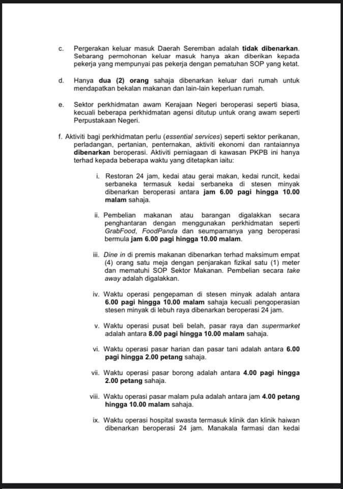 Waktu keluar malam pkpb. Waktu operasi klinik dan hospital kerajaan dan swasta dibenarkan beroperasi 24 jam. Tiada had masa bagi kenderaan persendirian bergerak selepas jam 10 malam termasuk dari daerah ke daerah. Aktiviti ekonomi dalam kawasan pkpb.